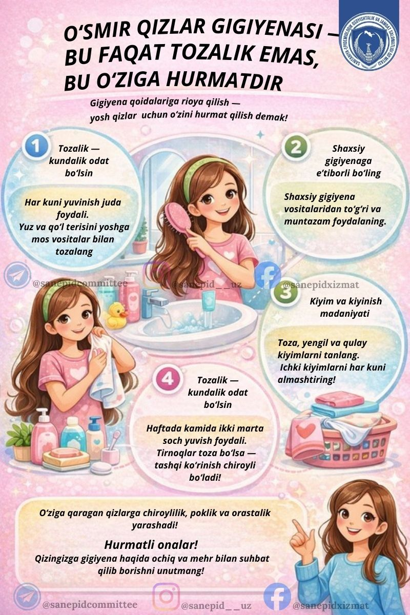 O‘SMIR QIZLAR GIGIYENASI — BU FAQAT TOZALIK EMAS, BU O‘ZIGA HURMATDIR! O‘smirlik — qizlar hayotidagi eng nozik, ammo muhim davr. Bu bosqichda tanadagi o‘zgarishlar bilan birga o‘ziga bo‘lgan ishonch, estetik did va tozalik madaniyati ham