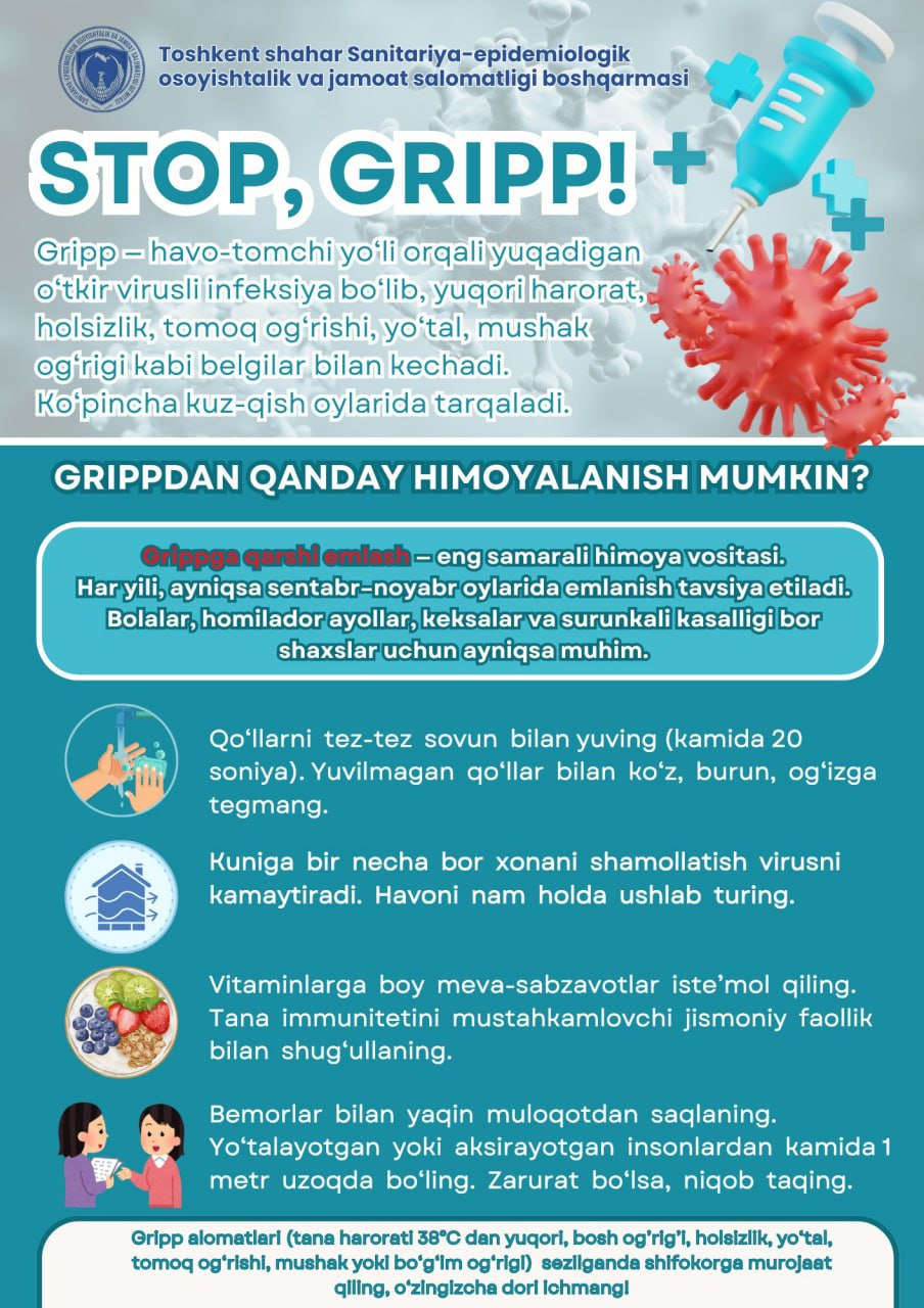 #amal_qiling 🤒 GRIPPNI YENGIL SHAMOLLASH DEB O'YLAMANG! Gripp o‘z vaqtida davolanmasa — bronxit, zotiljam, yurak yoki buyrak asoratlariga olib kelishi mumkin. Ba’zan esa og‘ir kechib, hayot uchun xavf tug‘diradi. 😷Shuning uchun hozirdanoq