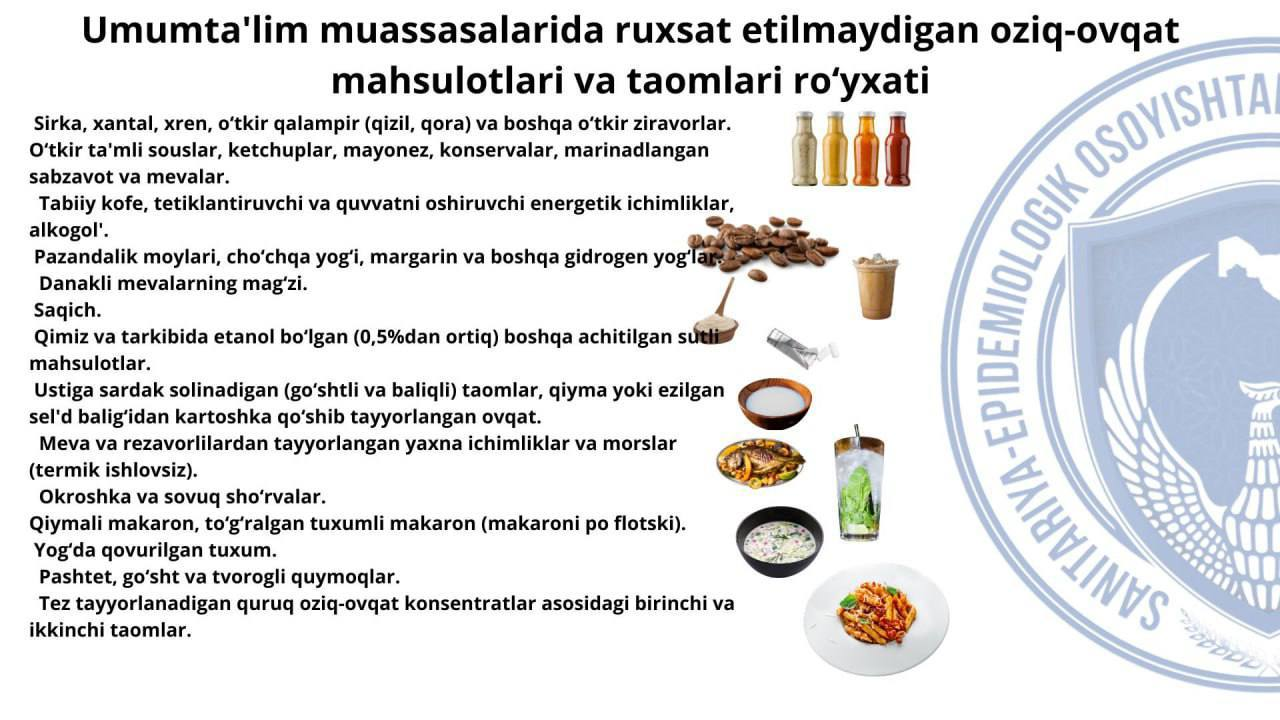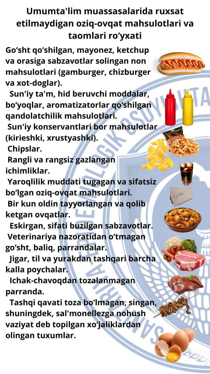 #INFOGRAFIKA Umumta'lim muassasalarida sotishga ruxsat etilmaydigan oziq-ovqat mahsulotlari va taomlari ro'yxati