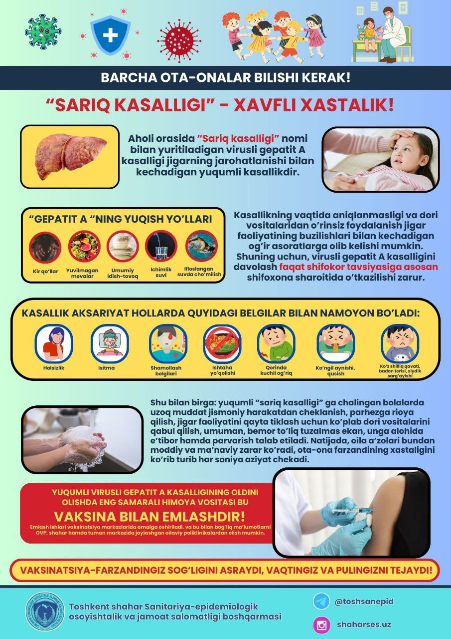 ❓Asosan bolalar o'rtasida uchraydigan virusli gepatit A kasalligi qay tarzda yuqadi va uni oldini olish choralari qanday?