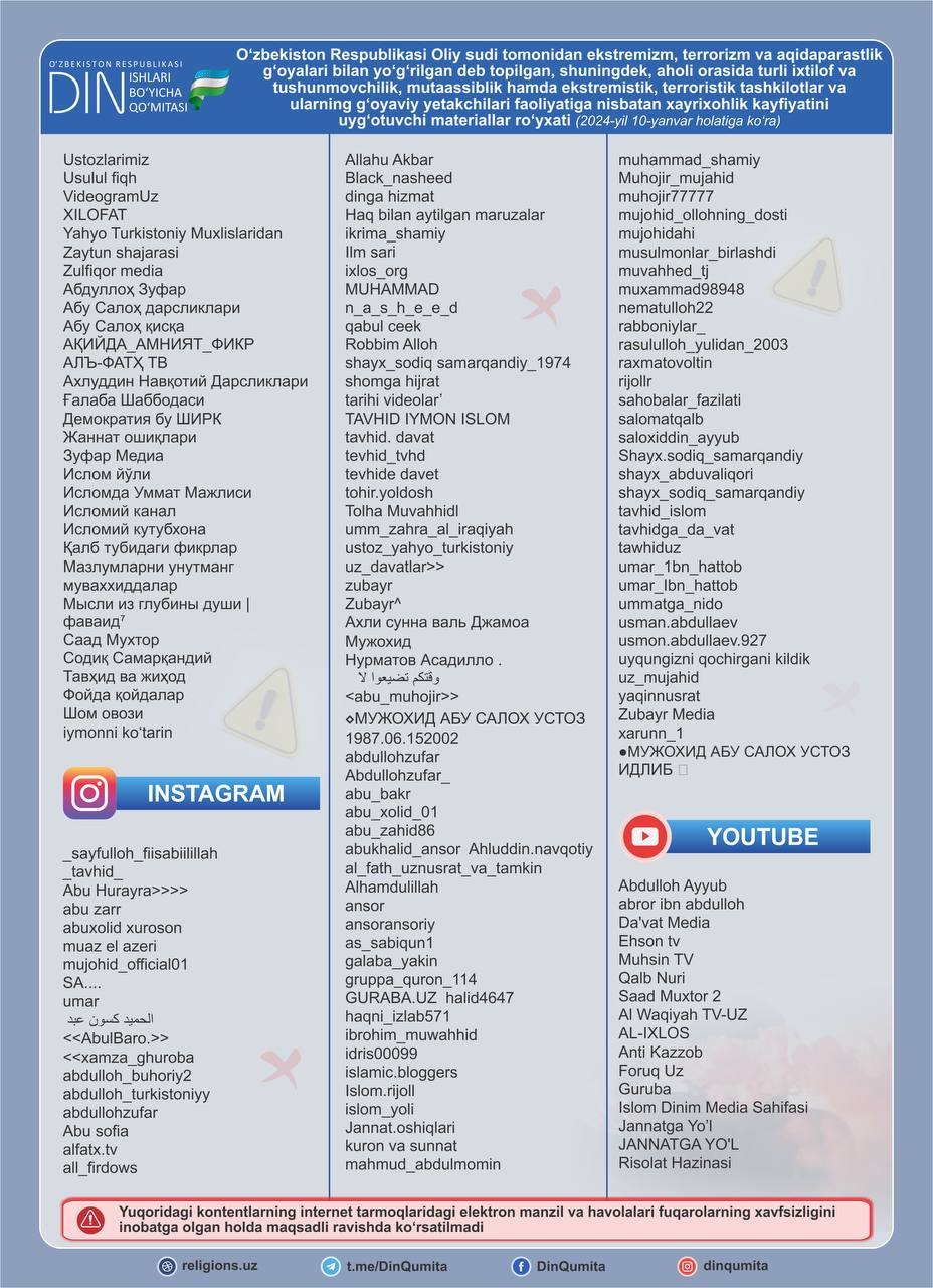 Маълумот ўрнида, Ўзбекистон Республикаси Олий суди томонидан 2024 йил январь ойида янгиланган, экстремизм ва терроризм ғоялари билан йўғрилган деб топилган ва Ўзбекистонга олиб кириш, тайёрлаш, тарқатиш ва намойиш этиш тақиқланган Telegram, YouTube к